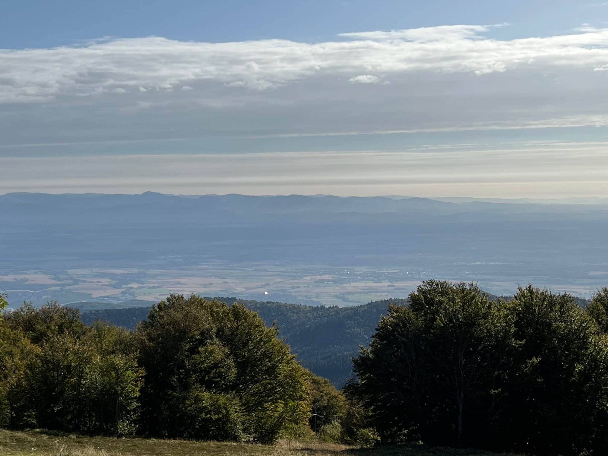 Trotz vollem Magen schliefen alle gut und stiegen am nächsten Morgen erwartungsvoll in unseren Klein-Bus zur Fahrt auf die Route des Crêtes. Den Aufstieg über die unzähligen Serpentinen meisterte unser Fahrer Daniel mühelos, während wir traumhafte Landschaft bewundern konnten. Ein kurzer Zwischenhalt auf dem Gipfel unterhalb des Grand Ballon (1424 m), um in einer Boutique de Souvenirs lokale Produkte zu erstehen oder anzuschauen, bevor wir ein paar Kilometer weiter in der Ferme «Auberge du Grand Ballon» zum Mittagessen erwartet wurden. Wieder ein üppiges Mahl…