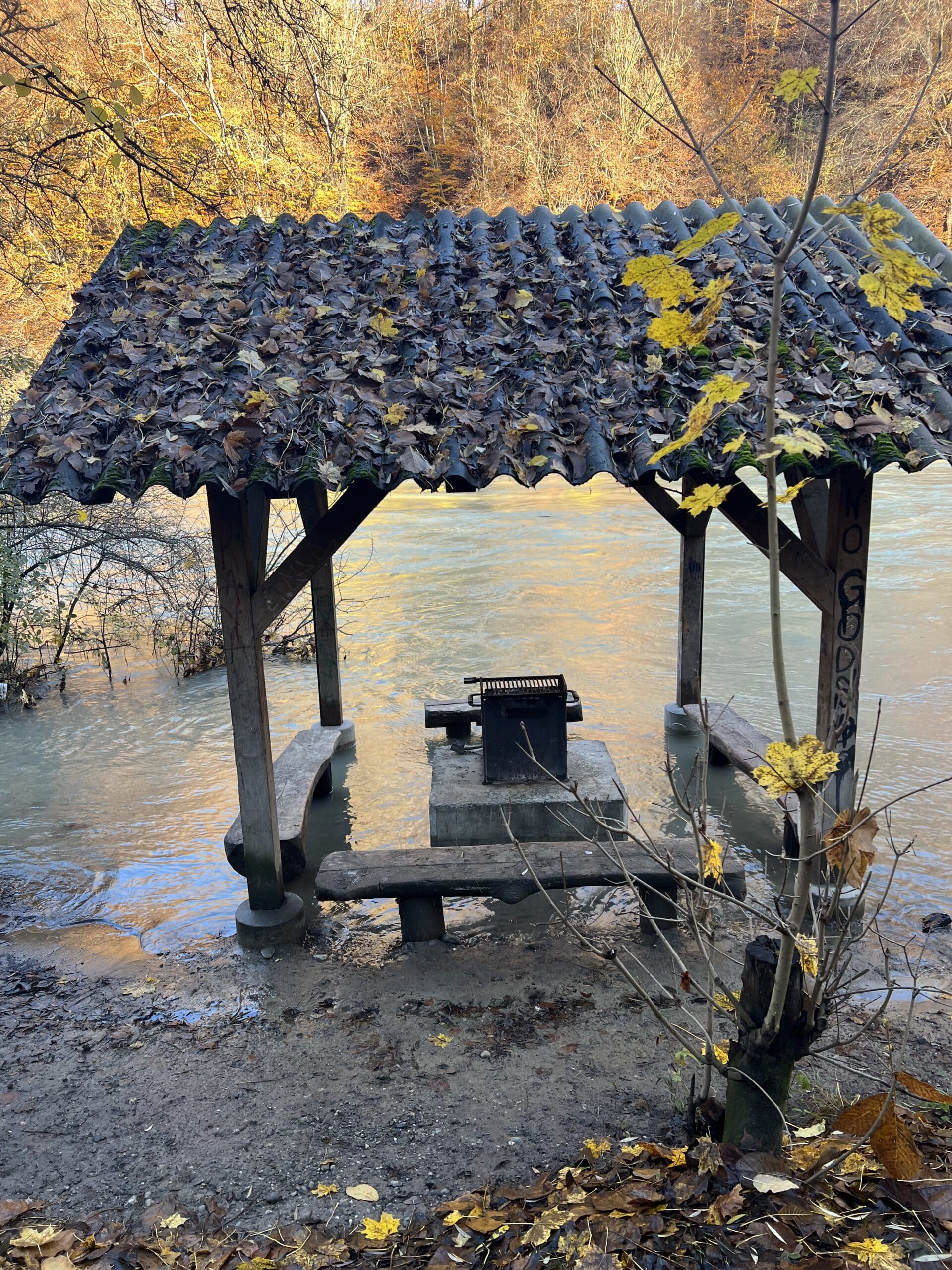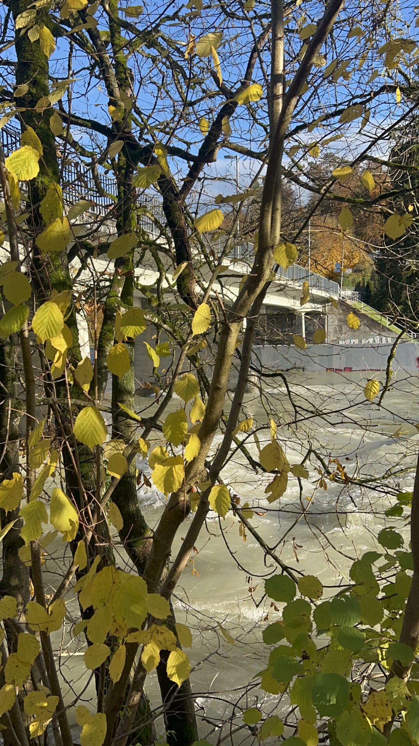«Was sagten wir über diese Wanderung?» fragte Sylvia Den lachend den Wanderleiter Jean-Jacques und seinen Stellvertreter Jean-Pierre Kaegy, «Das ist doch mal eine Wanderung, bei der gar nichts schiefgehen kann.» Von wegen! Hochwasser! Schon von der Halenbrücke aus sahen wir, dass die Aare zum Strom angestiegen war. Man fühlte sich wie am Rhein. Der erste Teil des Uferwegs verlief für uns denn auch ziemlich kurz und feucht. Beim Überqueren eines «Wildwassers», das sich unprogrammgemäss in den Uferweg gefressen hatte, rutschte eine Pantherin aus – und lief den Rest des Nachmittags mit lehmverschmierten Hosen herum. Abenteuerlich!