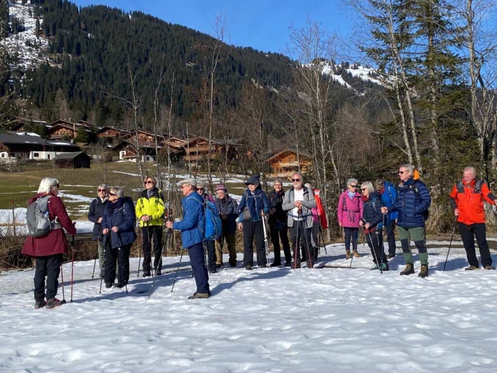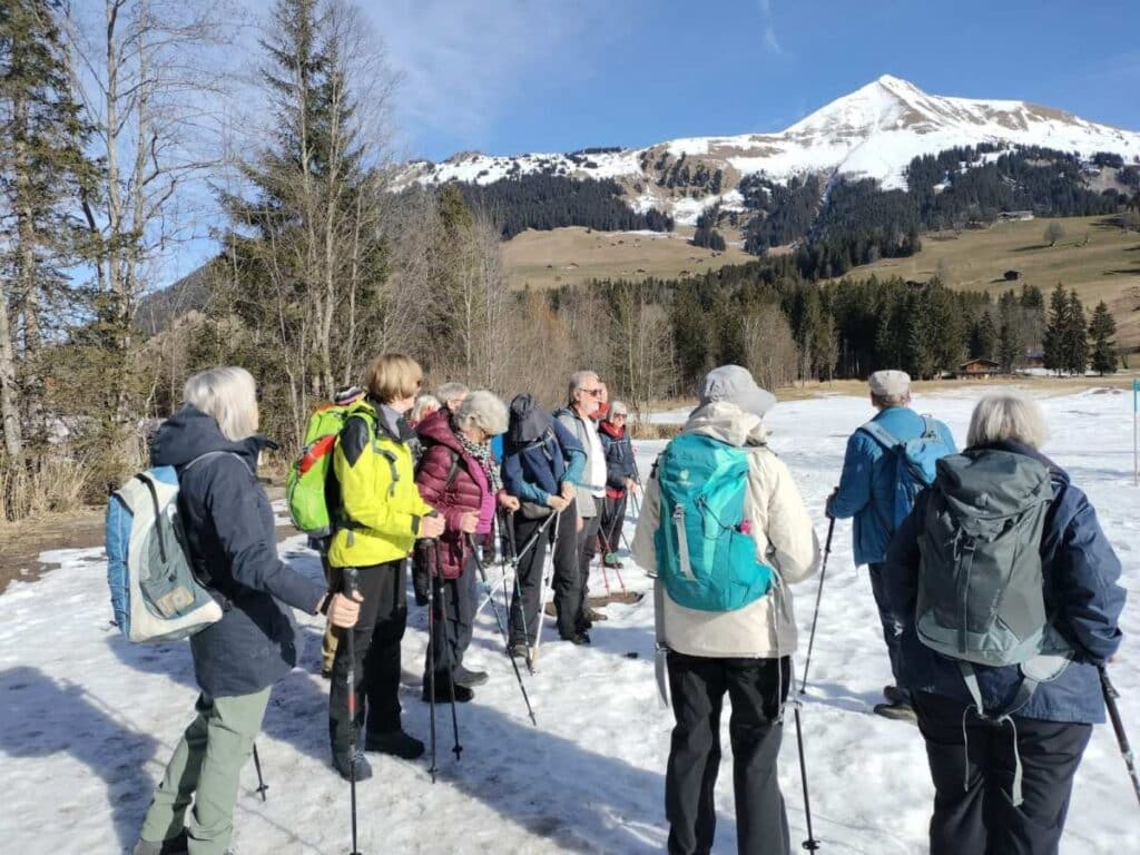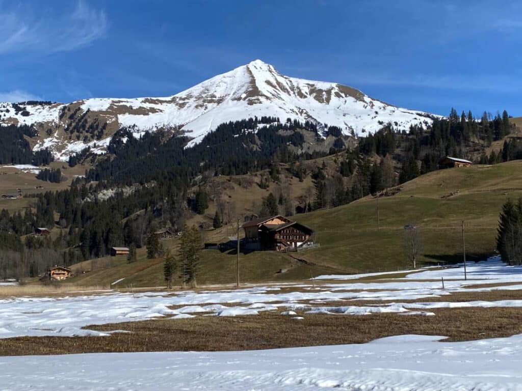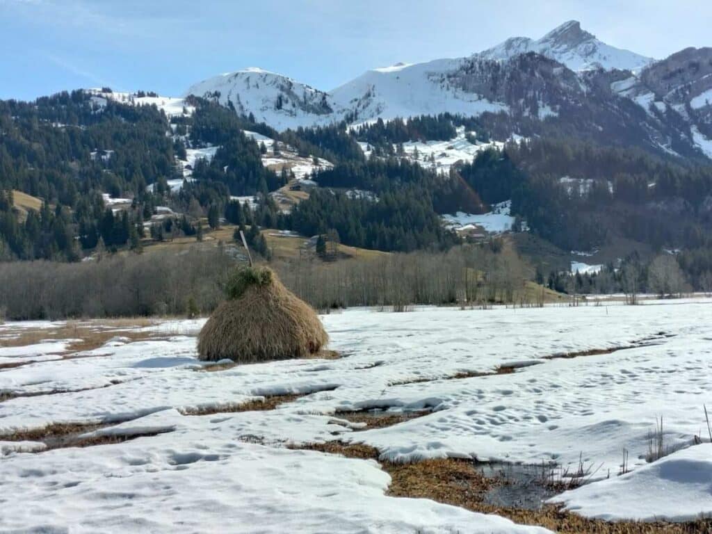Die weissen festgepressten Pistenbänder auf grünbraunem Land und die Schneekanonen wecken so gar kein Verlangen nach Schifahren. Von Gstaad bringt uns das Postauto nach Rohrbrücke Lauenen nahe an den Wanderweg. Daneben das Moorland, ein natur-echt schneebedecktes Feld mit «Tristen». Heinz erklärt, dass das Schilf, das pyramidenförmig um eine Stange aufgebaut und mit den Füssen festgepresst ist, als Einstreue für die Kühe genutzt wurde, vielleicht noch wird… Um diese Tradition zu bewahren, wird die aufwändige Arbeit heute gesponsert. Heinz stellt uns auch seine guten Bekannten vor: die Berggipfel rundum. «Das isch der Gifferspitz, dert ds Spitzhorn. U weles ds Mutthorn? Dänk das runde!»