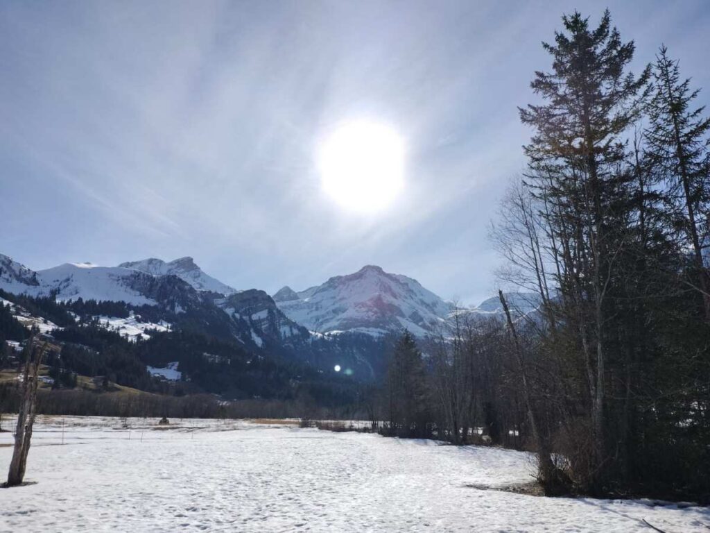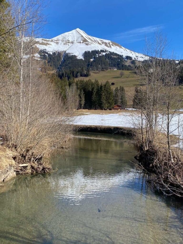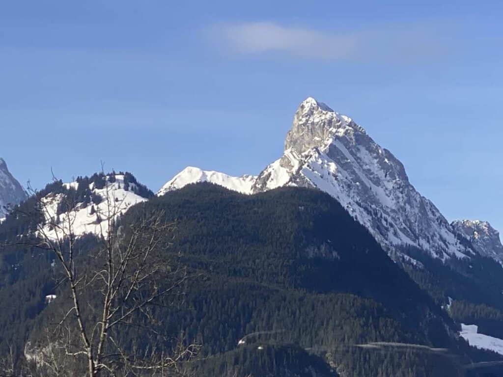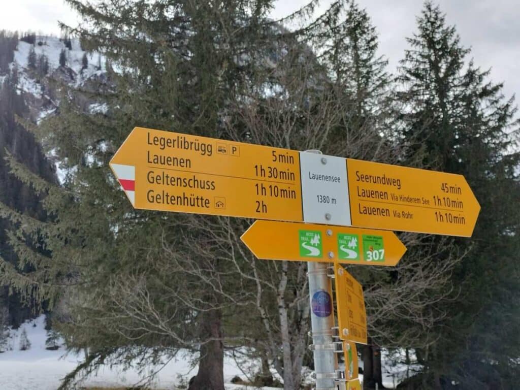 Die weissen festgepressten Pistenbänder auf grünbraunem Land und die Schneekanonen wecken so gar kein Verlangen nach Schifahren. Von Gstaad bringt uns das Postauto nach Rohrbrücke Lauenen nahe an den Wanderweg. Daneben das Moorland, ein natur-echt schneebedecktes Feld mit «Tristen». Heinz erklärt, dass das Schilf, das pyramidenförmig um eine Stange aufgebaut und mit den Füssen festgepresst ist, als Einstreue für die Kühe genutzt wurde, vielleicht noch wird… Um diese Tradition zu bewahren, wird die aufwändige Arbeit heute gesponsert. Heinz stellt uns auch seine guten Bekannten vor: die Berggipfel rundum. «Das isch der Gifferspitz, dert ds Spitzhorn. U weles ds Mutthorn? Dänk das runde!»