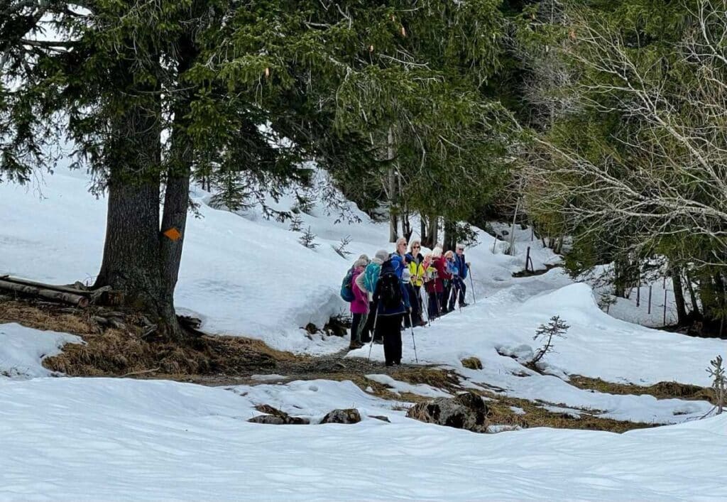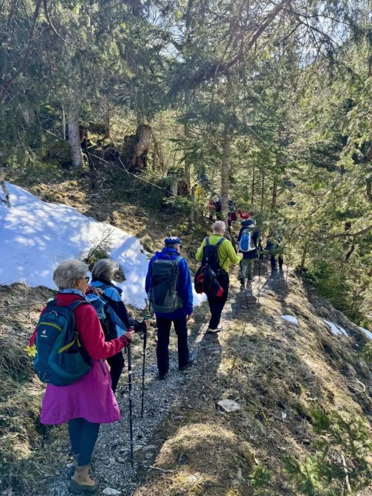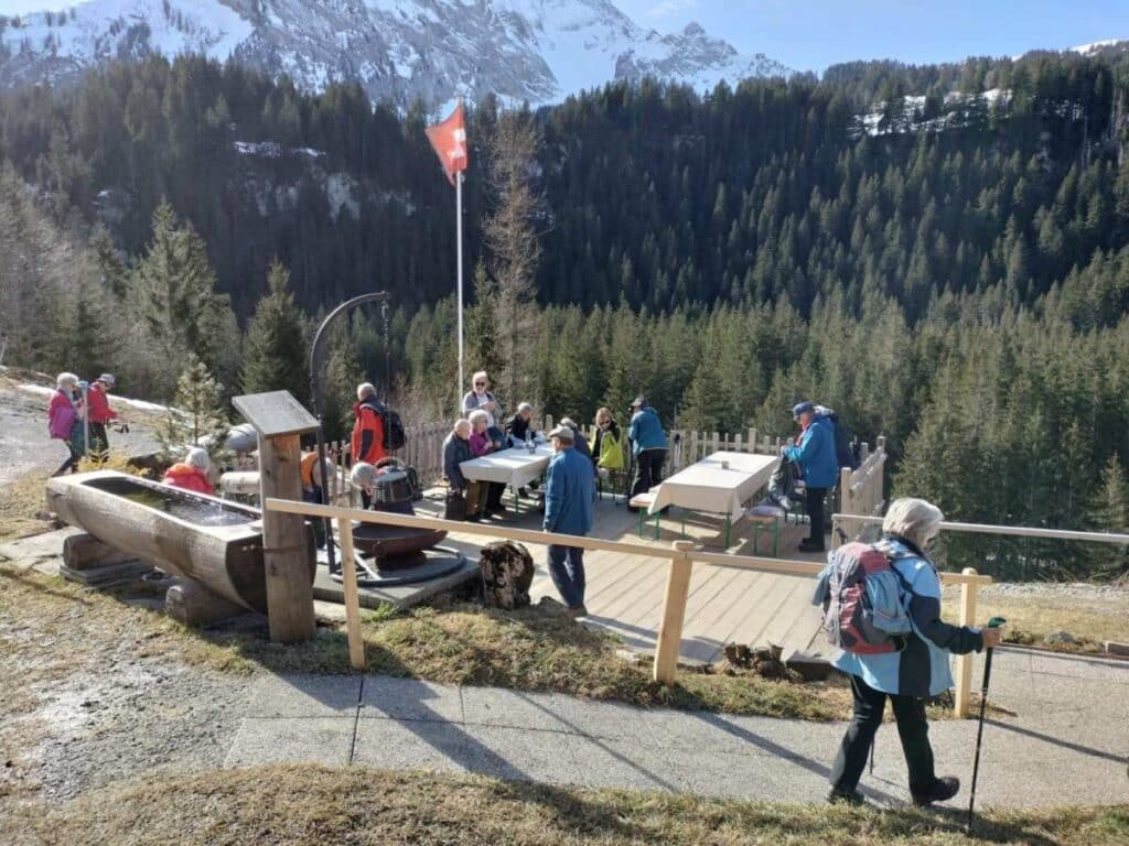Mit Stöcken geht jetzt das Wandern los, wir 18 Leute schön hintereinander. Wir erleben die Schönheit von Bergwelt und Naturschutzgebiet, auch wenn wir gut auf den Weg achten. Fürs Mittagspicknick halten wir Einkehr beim Beizli Bochtehus. Wir dürfen picknicken auf der Terrasse bei Sonnenschein und gönnen uns ein Getränk aus dem Restaurant. Die aufmerksame Gastfreundschaft freut uns sehr.