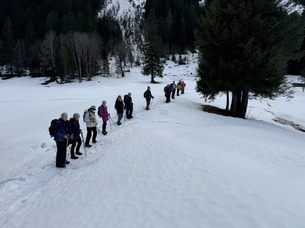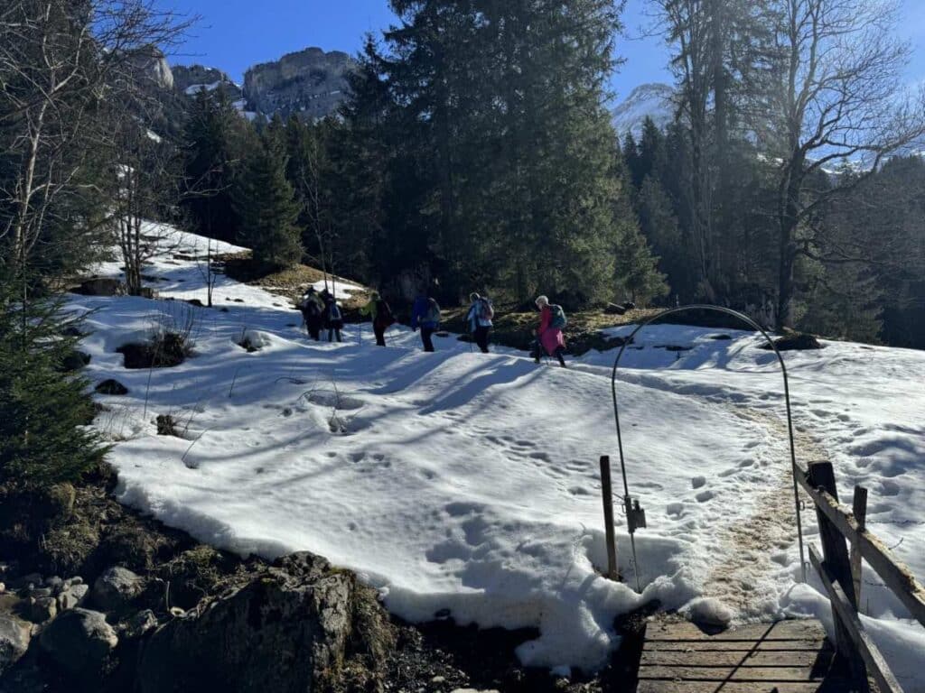Nun ist die Rossfallenschlucht angesagt. Der Wanderleiter mimt mit den Händen ein enges Weglein und einen Abgrund, so wähle ich die angebotene Alternative; zu dritt gehen wir auf der Strasse und stossen später wieder zu unserer Truppe, die gerade dabei sind, Gleitschutz zu montieren. Mit den «Iseli» gesichert gehen wir nun dem See nach – manchmal ist schwer auszumachen, wo auf der Schnee-Ebene nun vereister See ist und wo Land. Gut, dass ein kleiner Weg ausgetreten ist. Dann ertönt leise Musik und wir sind mit dem Sänger im Handy einig: «I gloube, i gange no meh a Louwenesee…»