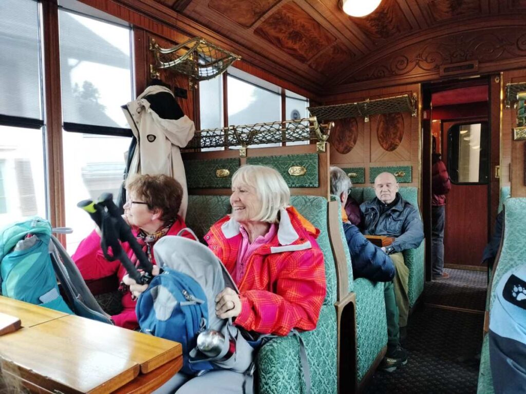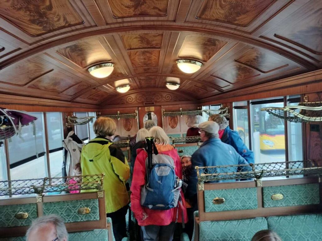 Beim Wechsel von dieser Traumlandschaft in die Zivilisation merken wir, dass die Sonne verschwunden ist, dafür taucht das Restaurant «Alpenland» auf, wo wir Schlusseinkehr halten. Unsere Seeumrundung schliesst sich hier, wir gehen wieder zur Busstation. Eine Überraschung gibt es noch in Gstaad, als genau vor uns ein Wagen «Belle Epoque» hält und für uns reserviert ist. Auch wenn eine gut hörbare Kinderhorde schon drin sitzt, geniessen wir es fürstlich in diesem romantischen Plüsch mit edlem Holz und Messing.