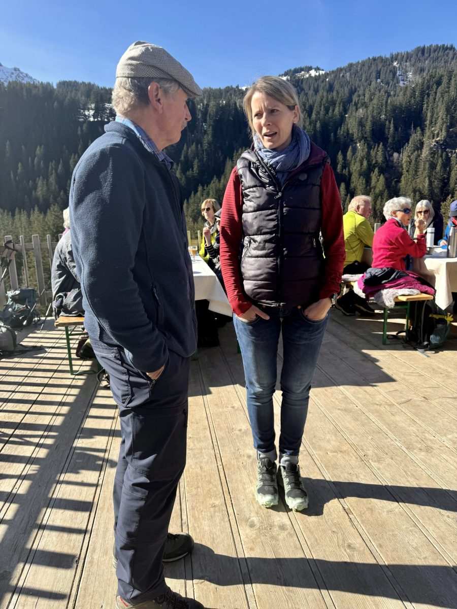 Mit Stöcken geht jetzt das Wandern los, wir 18 Leute schön hintereinander. Wir erleben die Schönheit von Bergwelt und Naturschutzgebiet, auch wenn wir gut auf den Weg achten. Fürs Mittagspicknick halten wir Einkehr beim Beizli Bochtehus. Wir dürfen picknicken auf der Terrasse bei Sonnenschein und gönnen uns ein Getränk aus dem Restaurant. Die aufmerksame Gastfreundschaft freut uns sehr.