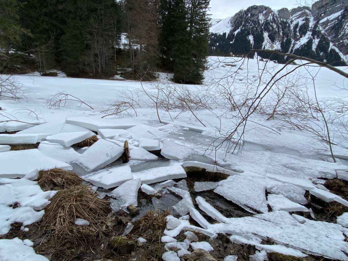 Nun ist die Rossfallenschlucht angesagt. Der Wanderleiter mimt mit den Händen ein enges Weglein und einen Abgrund, so wähle ich die angebotene Alternative; zu dritt gehen wir auf der Strasse und stossen später wieder zu unserer Truppe, die gerade dabei sind, Gleitschutz zu montieren. Mit den «Iseli» gesichert gehen wir nun dem See nach – manchmal ist schwer auszumachen, wo auf der Schnee-Ebene nun vereister See ist und wo Land. Gut, dass ein kleiner Weg ausgetreten ist. Dann ertönt leise Musik und wir sind mit dem Sänger im Handy einig: «I gloube, i gange no meh a Louwenesee…»