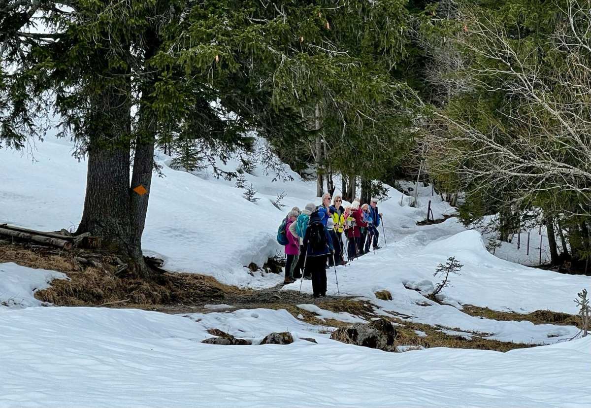 Die weissen festgepressten Pistenbänder auf grünbraunem Land und die Schneekanonen wecken so gar kein Verlangen nach Schifahren. Von Gstaad bringt uns das Postauto nach Rohrbrücke Lauenen nahe an den Wanderweg. Daneben das Moorland, ein natur-echt schneebedecktes Feld mit «Tristen». Heinz erklärt, dass das Schilf, das pyramidenförmig um eine Stange aufgebaut und mit den Füssen festgepresst ist, als Einstreue für die Kühe genutzt wurde, vielleicht noch wird… Um diese Tradition zu bewahren, wird die aufwändige Arbeit heute gesponsert. Heinz stellt uns auch seine guten Bekannten vor: die Berggipfel rundum. «Das isch der Gifferspitz, dert ds Spitzhorn. U weles ds Mutthorn? Dänk das runde!»