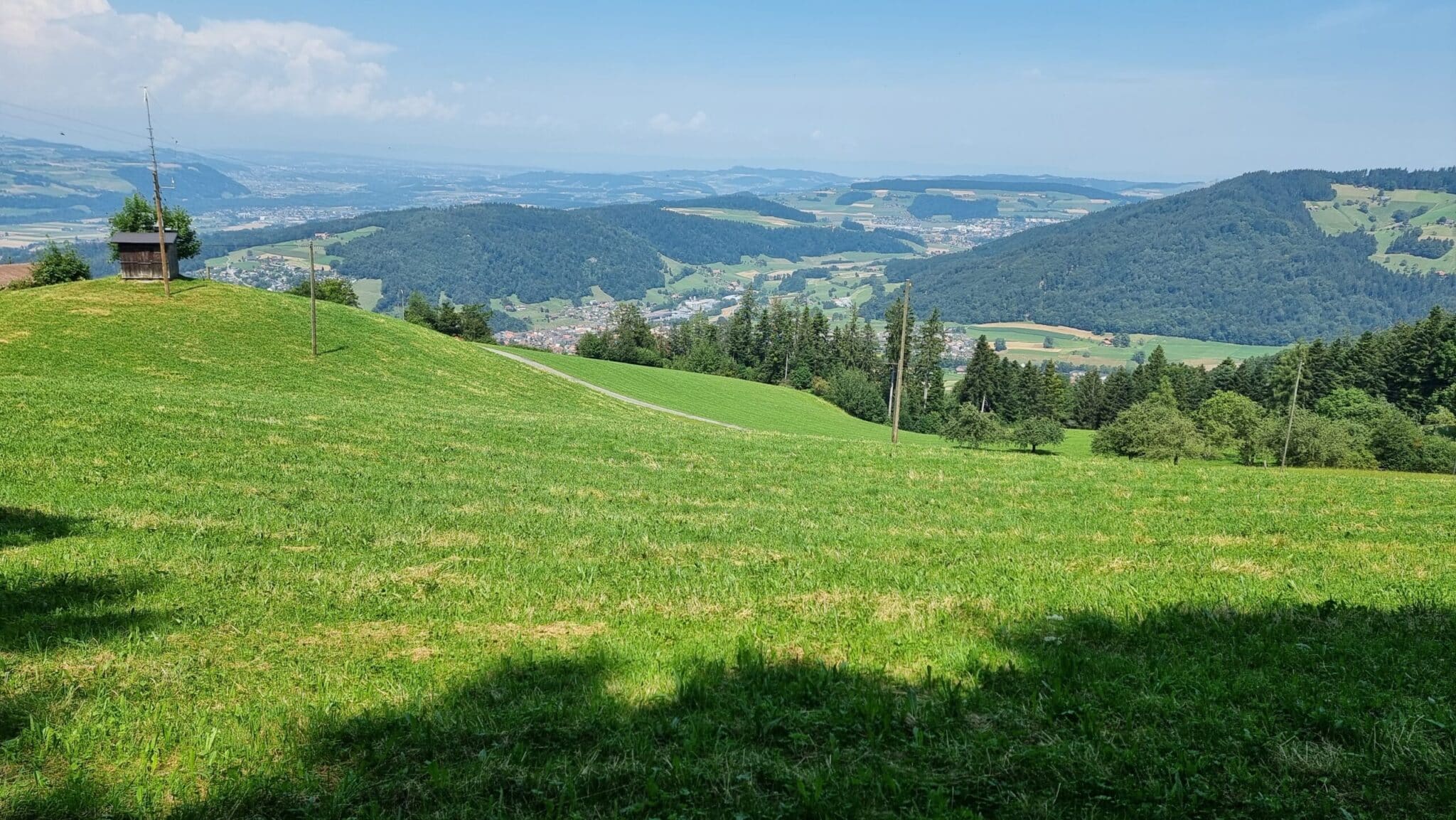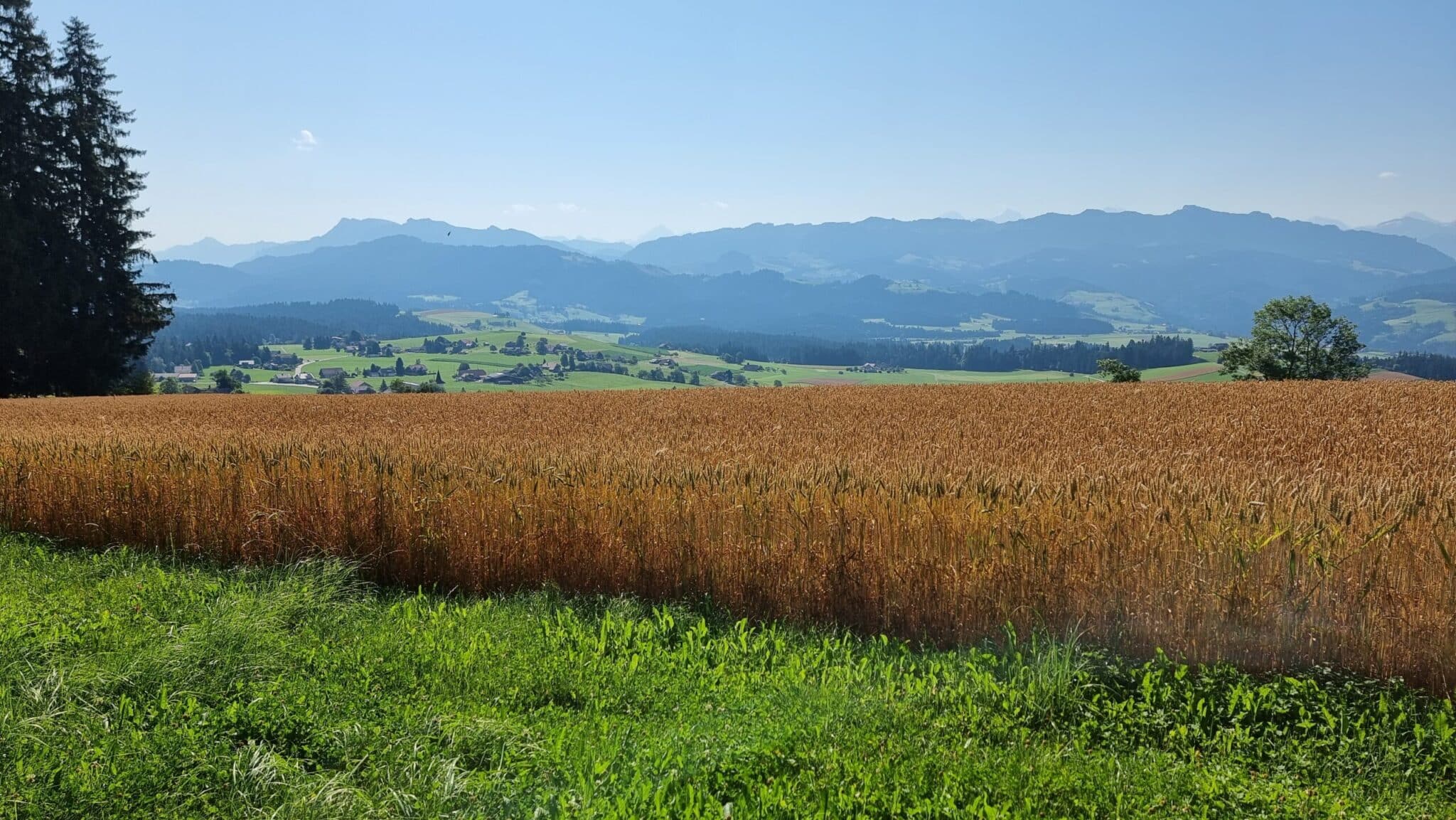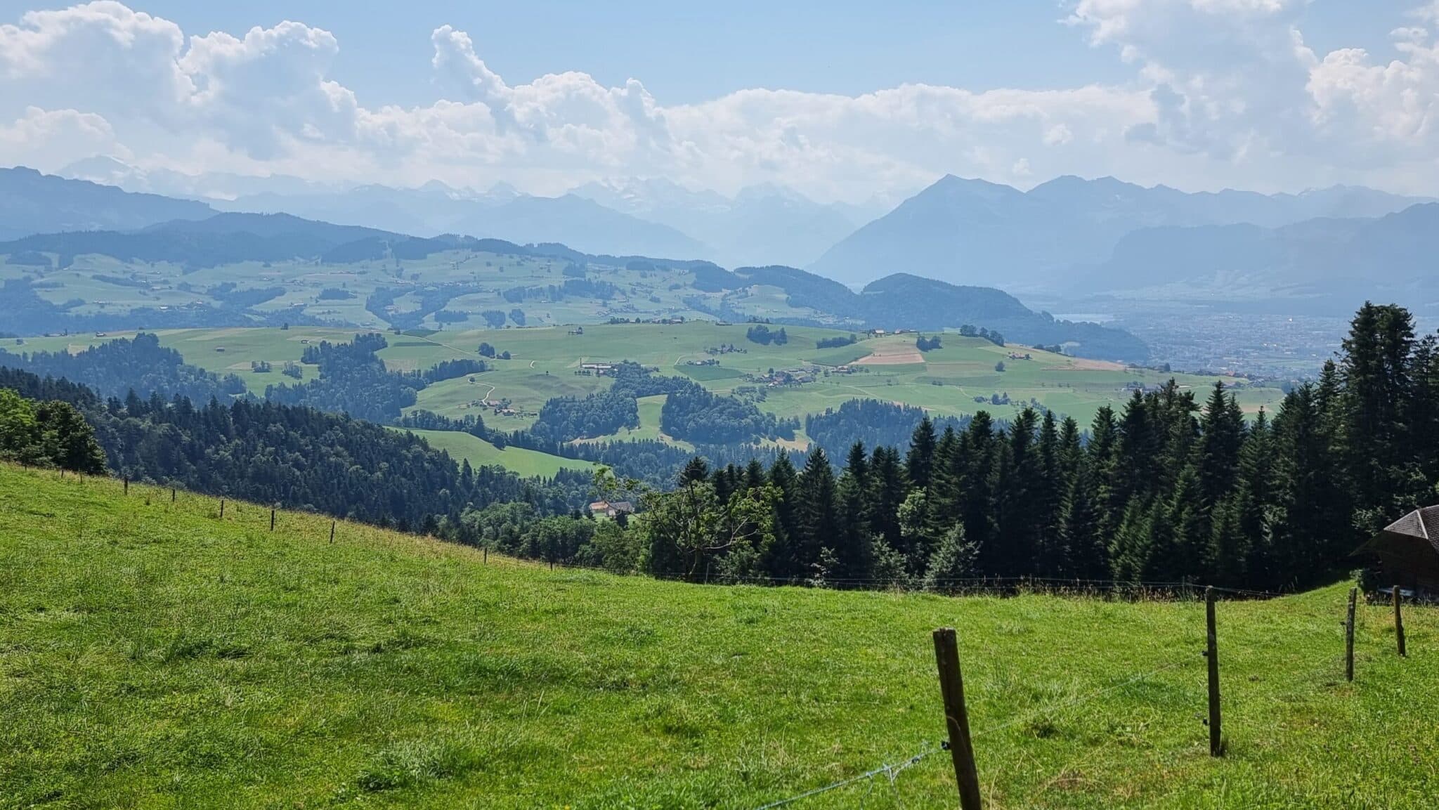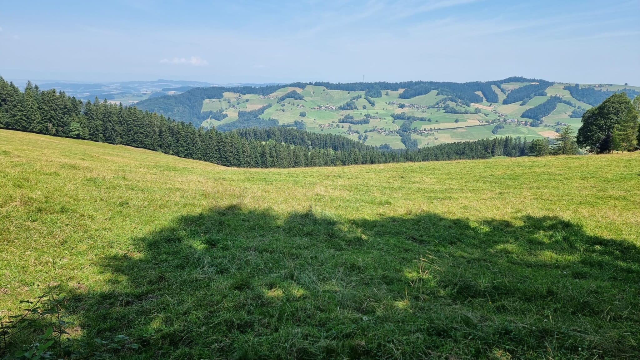 Wunderbar rhythmisiert der Wechsel von sonnigen Abschnitten, entlang von Weiden, an stolzen Bauernhöfen vorbei, durch kühlende Waldabschnitte beschützt, wieder hinaus auf die freiliegenden Wege auf der Höhe mit einer Aussicht ringsum auf das Tal, die Hügel und Berge.