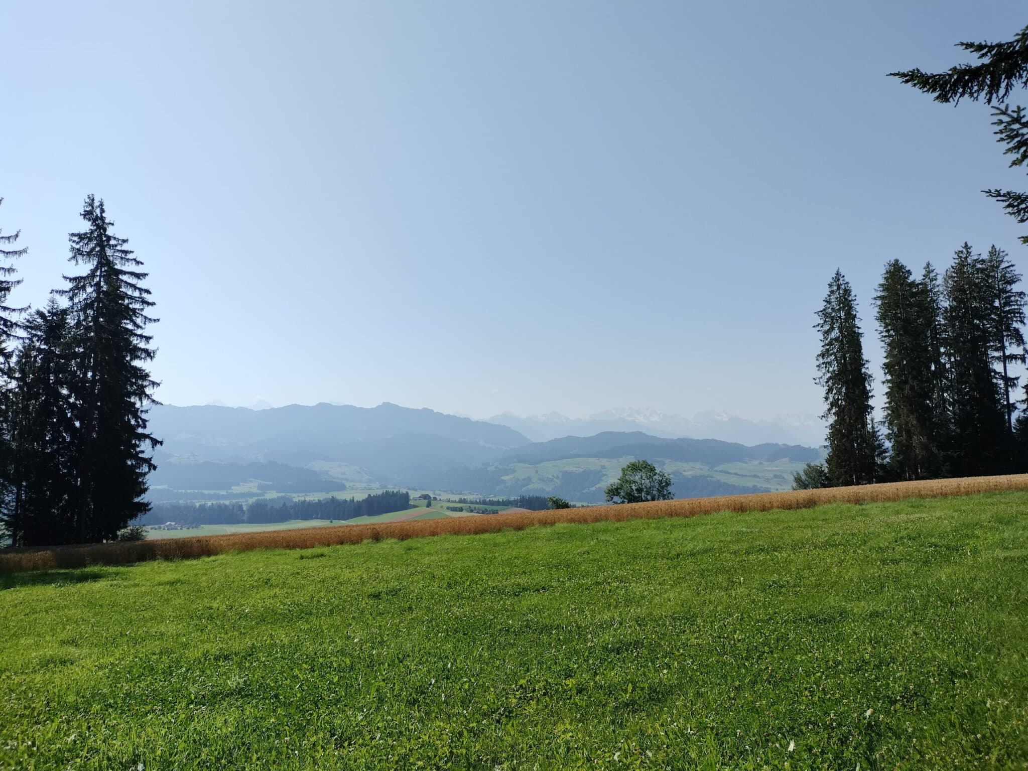 Der Abstieg durch den Wald, eine kurze Strecke noch auf dem Asphalt, ein malerisches Feld mit Kornmaden rechterhand und: endlich das Bier als Belohnung in Oberdiessbach! Nein, die Beiz geschlossen, das Bier wird nach Bern verschoben. Die Stimmung steigt. Wir feiern uns, als hätten wir die Wander-Olympiade gewonnen und kommen trocken nach Hause.