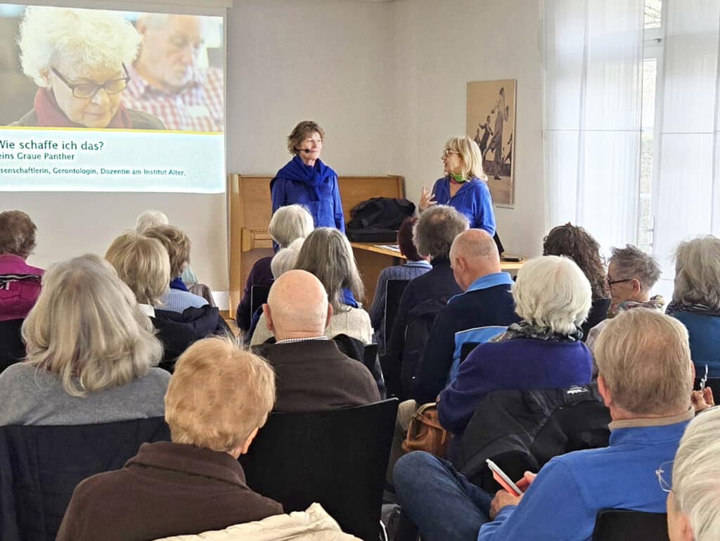 Die von Ursula Hürzeler organisierte Veranstaltung lockte knapp 30 PantherInnen (und Zugewandte) ins Domicil Mon Bijou. In einem kurzen Interview gab die Dozentin Auskunft zum Institut Alter der Berner Fachhochschule, wo sie lehrt und forscht. Überraschenderweise fängt für die Wissenschaftlerin DAS Alter bereits mit 45 an. Haben wir uns damals nicht im Vollbesitz unserer Kräfte gefühlt? Auf dem Höhepunkt unserer Karriere? Nun ja, die Aussage blieb unwidersprochen (ist uns ja heute auch wurscht).