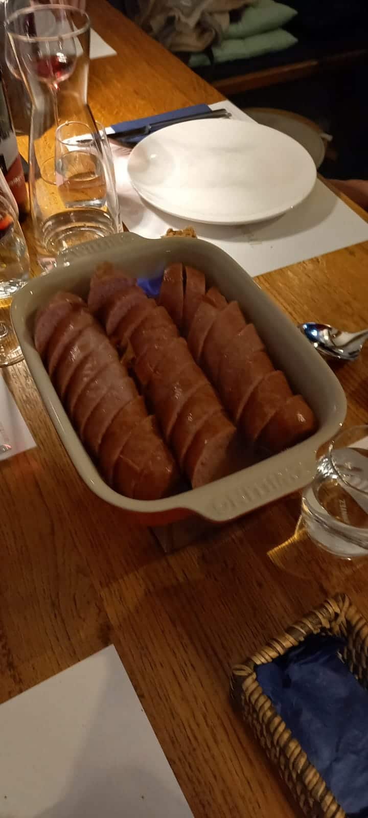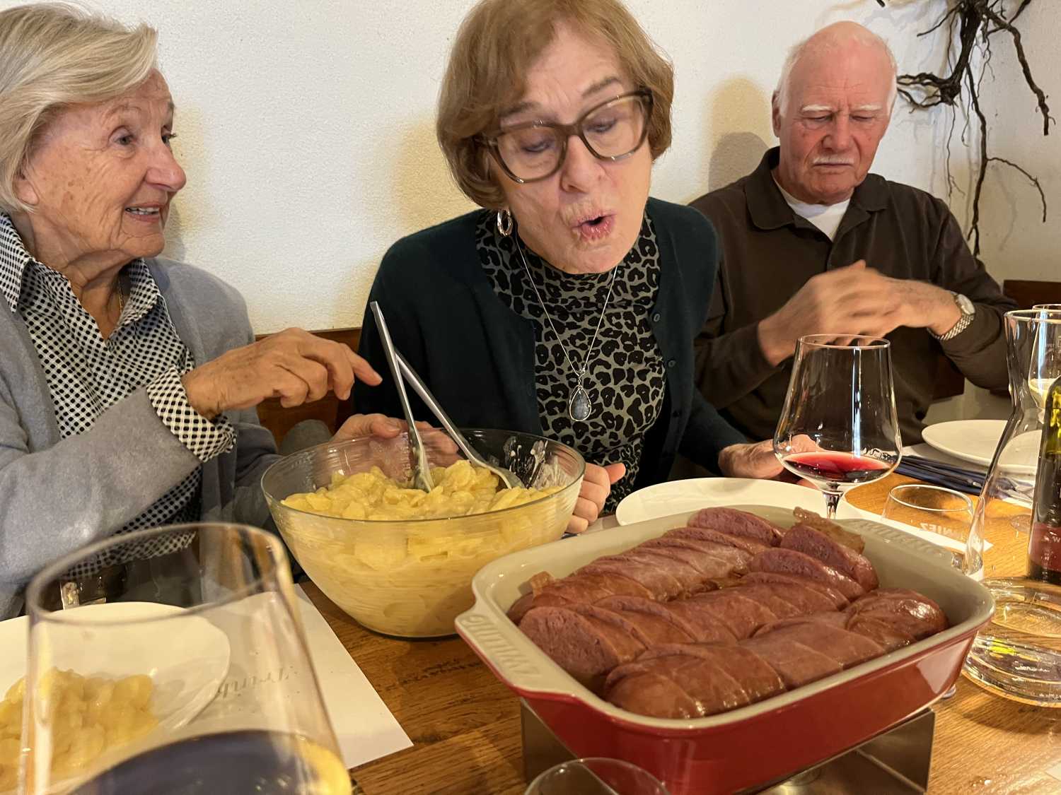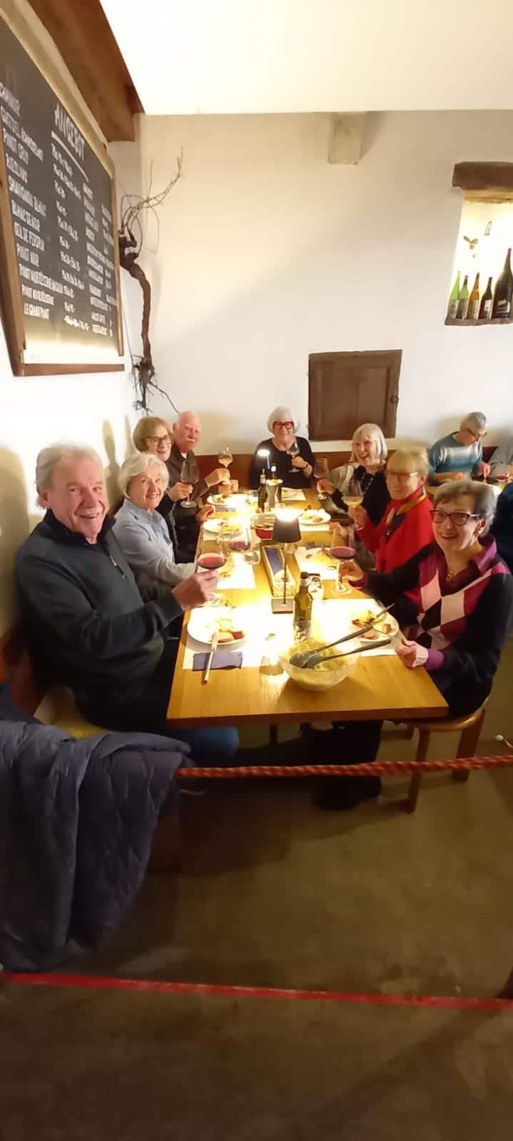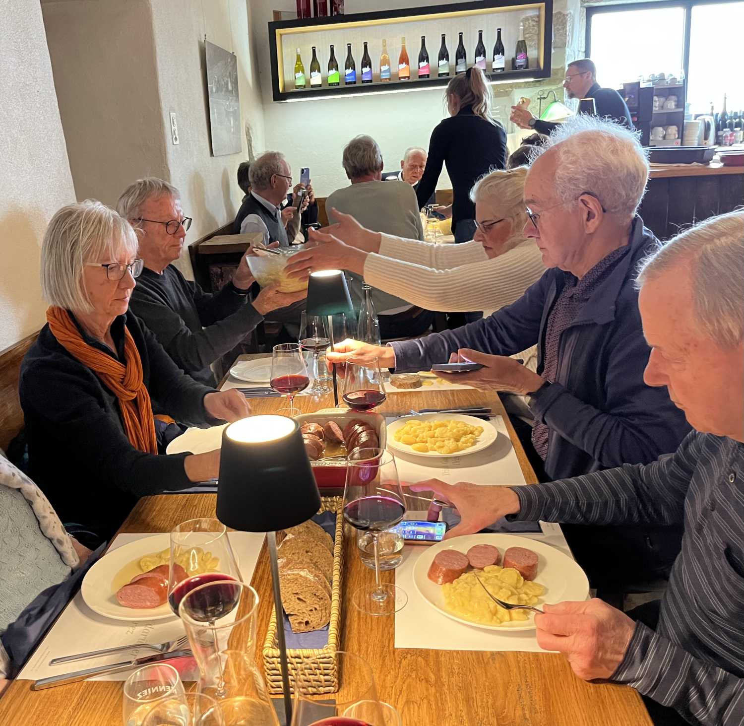 Nun wurde es Zeit, dass wir uns im gemütlichen Essenskellerraum an verschiedenen Tischen niederliessen. Nach der Getränkebestellung und dem Einschenken werden die Schüsseln mit den Treberwurstscheiben und dem warmen Kartoffelsalat aufgetischt. Alles hat wunderbar geschmeckt, es war ein Festessen. Nach dem Essen wurden noch Desserts aufgetragen und Kaffee serviert. Wer wollte, konnte das Ganze noch mit einem Glas Marc unterstreichen. Die Rückreise erfolgte dann problemlos.