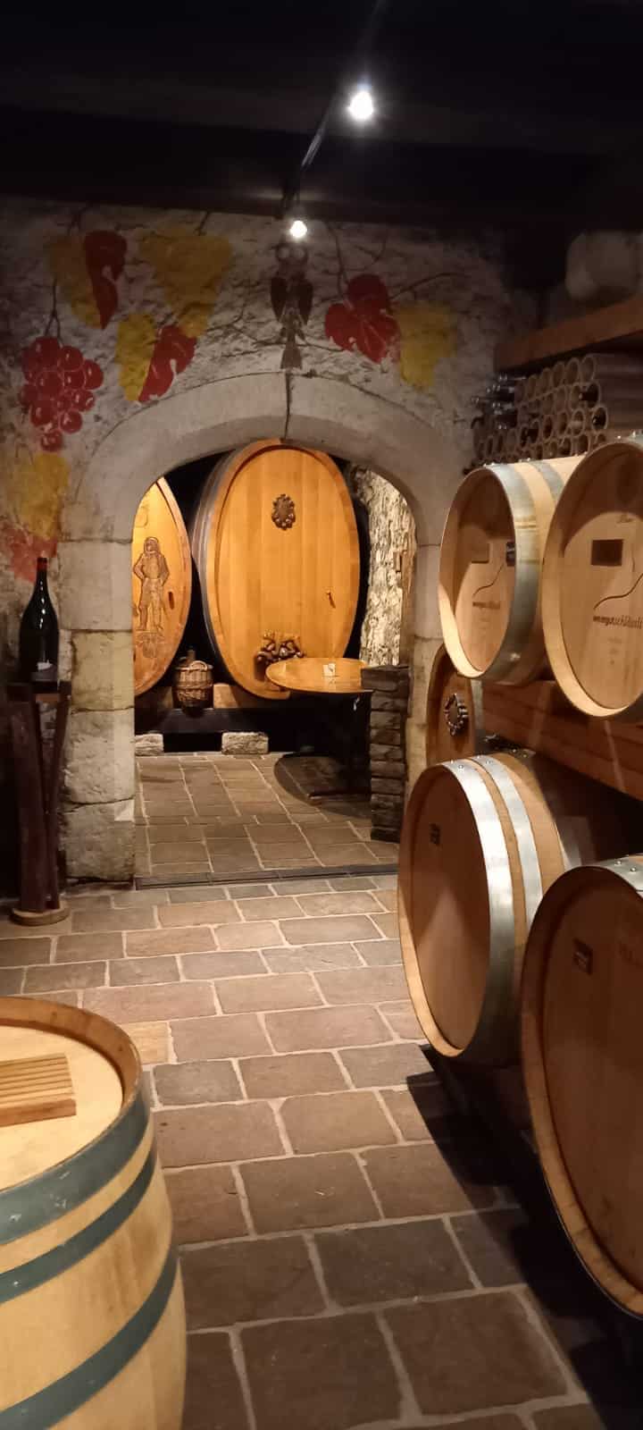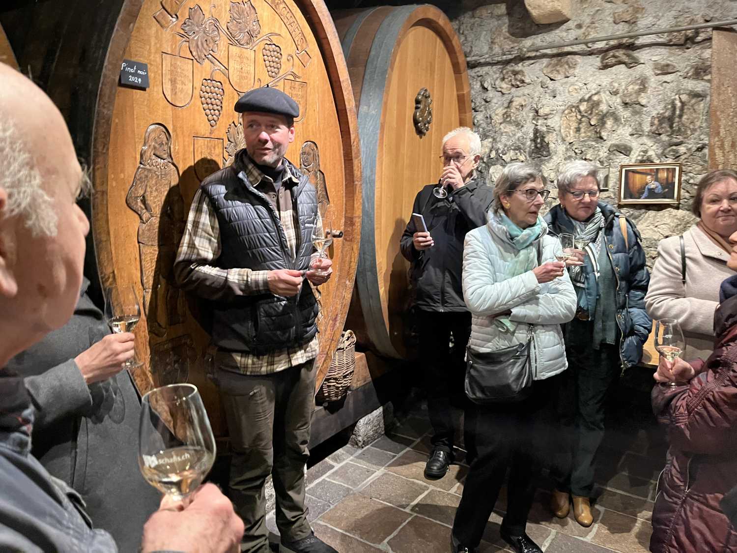 Danach wurden wir in den Weinkeller mit den grossen Fässern geführt und erhielten ein Glas Weisswein zur Degustation. Von diesem Wein sollten wir die Sorte und den Jahrgang herausfinden. Wir mussten passen, es war ein Sauvignon Blanc 2023. Wir hören noch weitere Details der Weinherstellung, so wird zum Beispiel aus roten Trauben auch Weiss- oder Roséwein hergestellt. In der Kellerei werden pro Jahr ca. 150 l Marc und ca. 30’000 l Wein hergestellt.