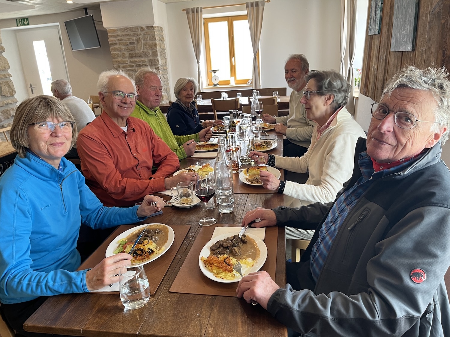 An «Windmühlen» vorbei – übrigens mit sehr vielen sehr lebendigen Vögel ringsum – und durch Fledermaus- und Wichtel-Wege gelangten wir zur Auberge de Peu-Péquignot («pöpegginio» ausgesprochen). Im schönen Restaurant genossen wir eine herrliche Rösti mit Begleitung – und dies jenseits des Röstigrabens !