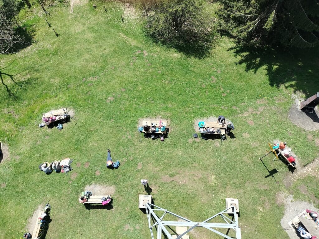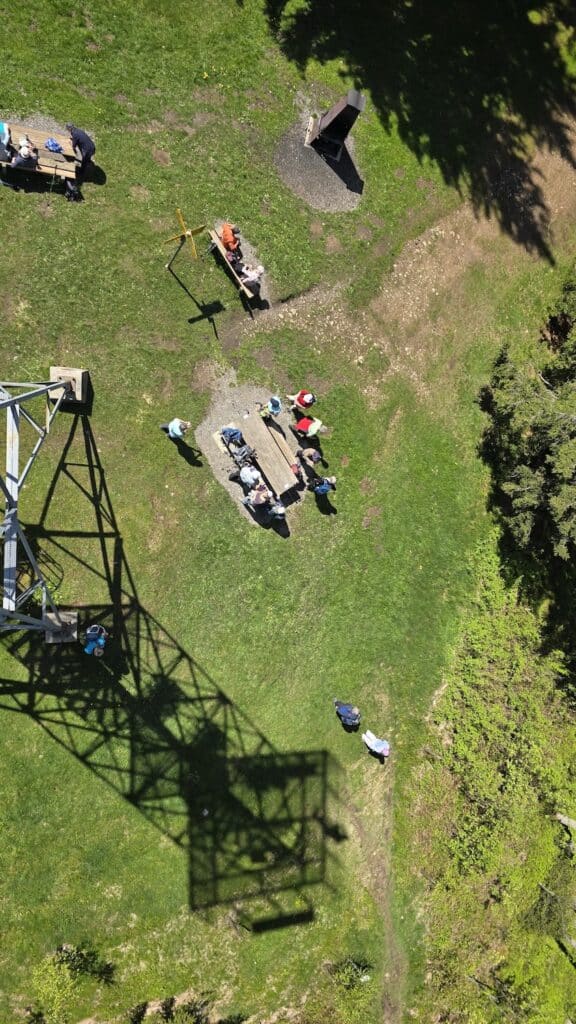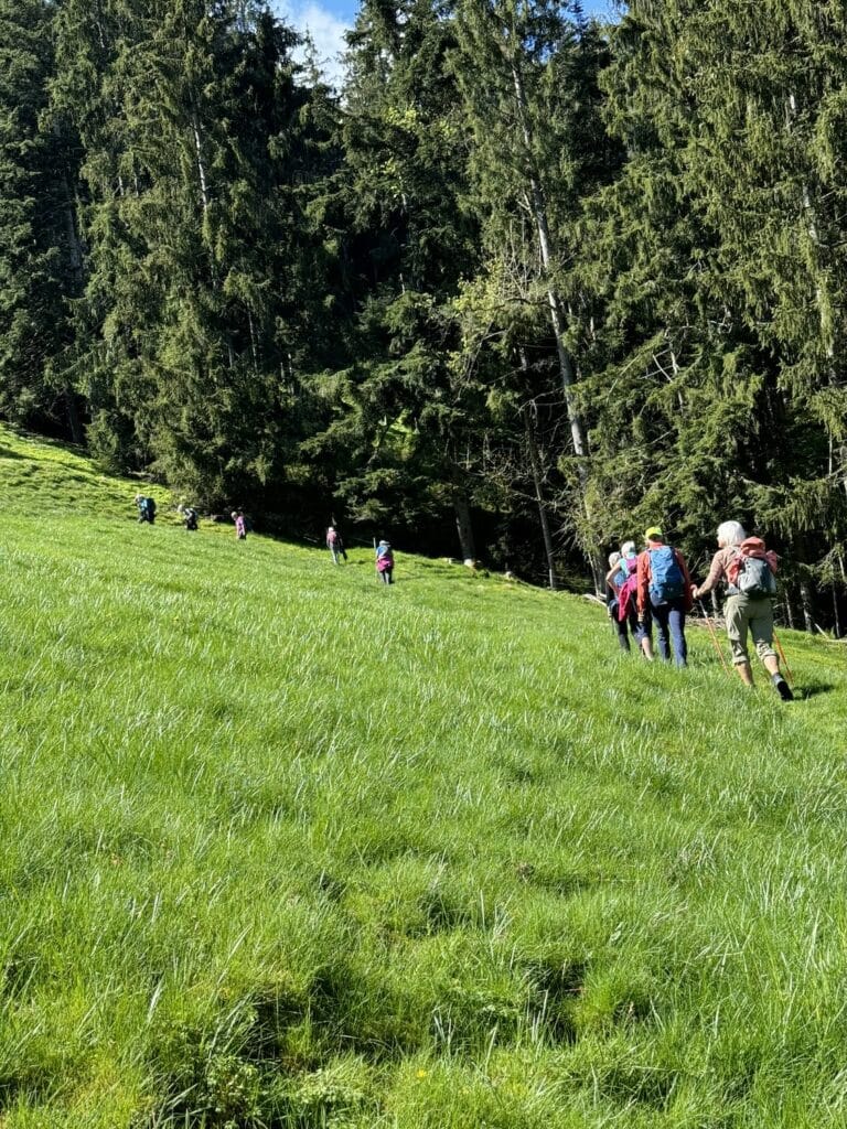 Die Wanderung alsdann ist anstrengend und stotzig. Stolz auf unsere Leistung erreichen wir die Bluemehöhe und vom hohen Bluemeturm werden wir mit dem prächtigen Rundumblick auf die Schneeberge und den tief unter uns liegenden blauen Thunersee belohnt. Eine bereichernde Wanderung findet mit dem Umtrunk auf der Reha Terrasse ihren Abschluss.