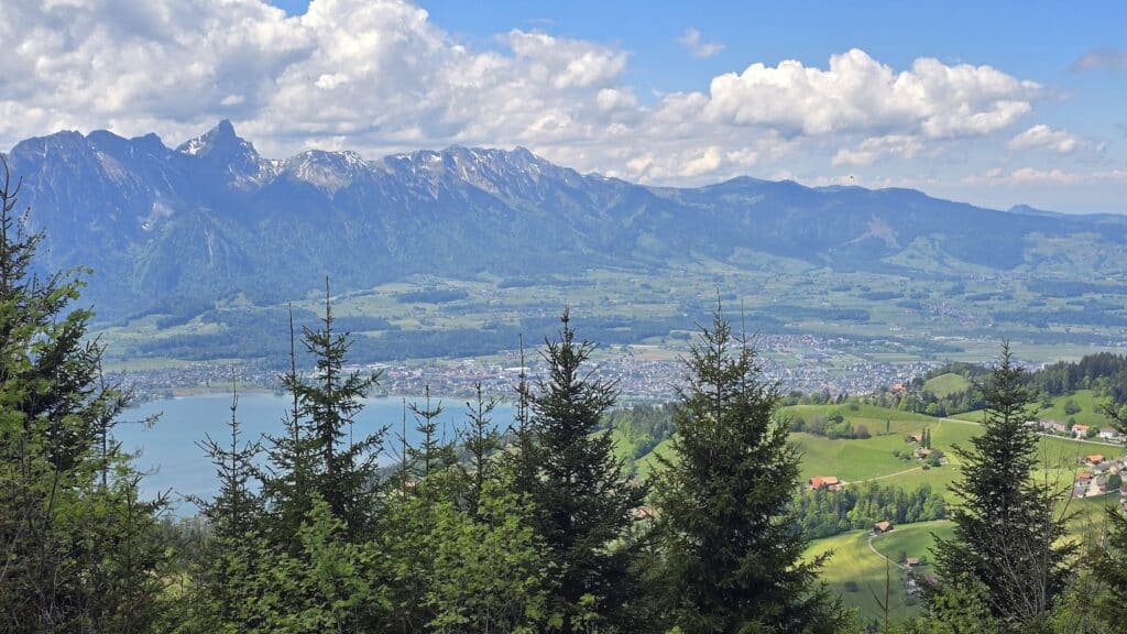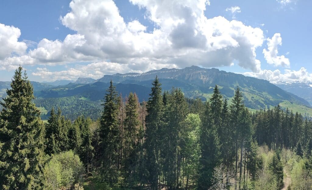 Ein Stück heile Welt in der Heimat von Elisabeth Vogt. An einem nicht zu überbietend strahlend schönen Frühlingstag entführt uns der STI-Bus aus der touristenübervollen Thuner Innenstadt kaum merklich in das satt grüne blumige Thuner und Steffisburger Hinterland vorbei an der Hochzeitskirche Buchen. Die Lunge des Aaretals wird umgrenzt vom Jura im Hintergrund, der Schrattenfluh, Sigriswiler Rothorn, Burst, Sieben Hengste, Hogant im Osten, vom Gantrisch mit Stockhornkette im Westen und Schwarzenegg und Heimenschwand im Norden. Die Fruchtbäume im taufrischen Teuffenthal auf 1000 m stehen in voller Blüte, Geissen, bimmelnde Kühe, Hühner, liebevoll gepflegte Gärten, ein Bild wie in einem Heimatfilm.