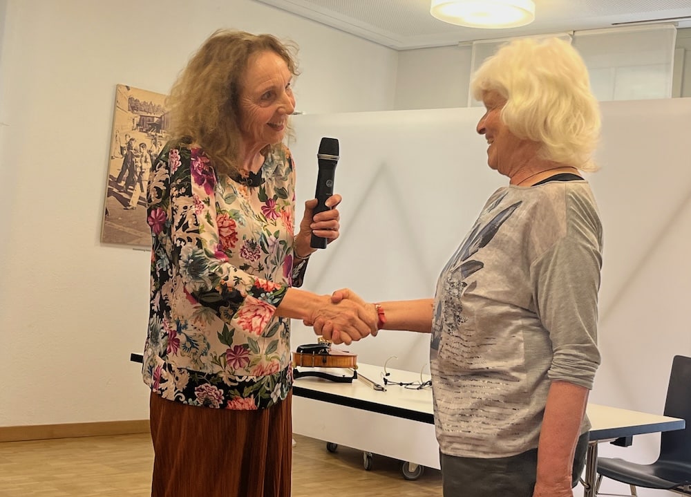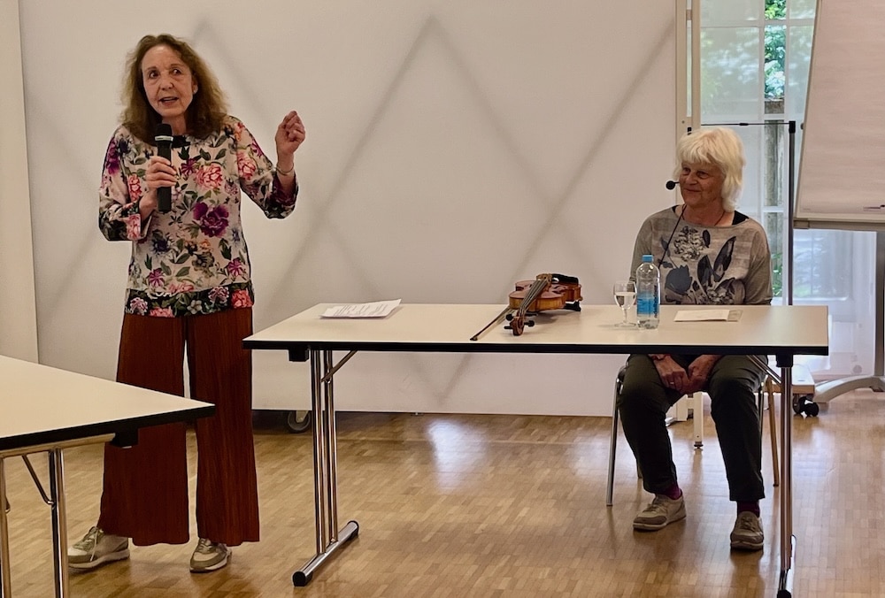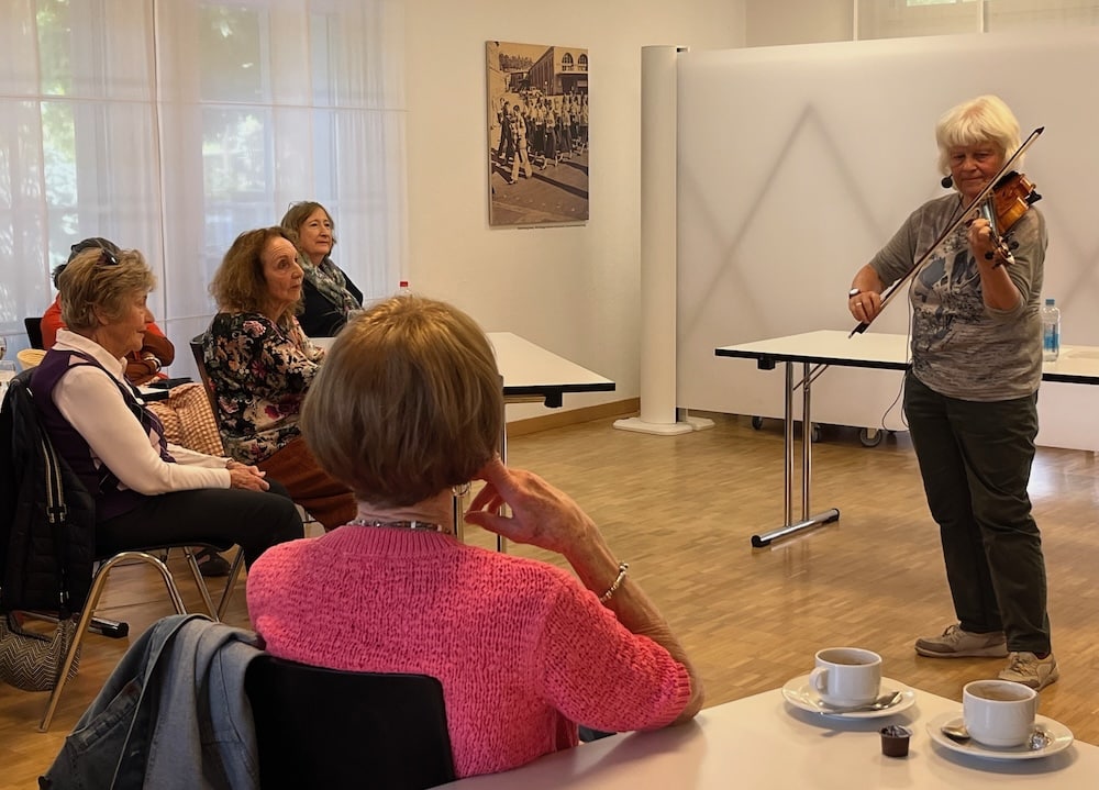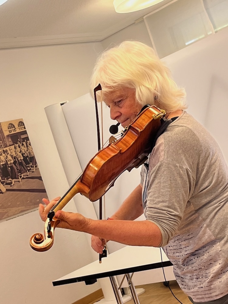 Barbara Könnig ist nicht allein gekommen. Sie hat eine ihrer Geigen mitgebracht und erfreut uns zur Einführung mit einer Improvisation, in welcher sie unsere freudige Stimmung aufgreift. Ein toller Einstieg ins Thema.