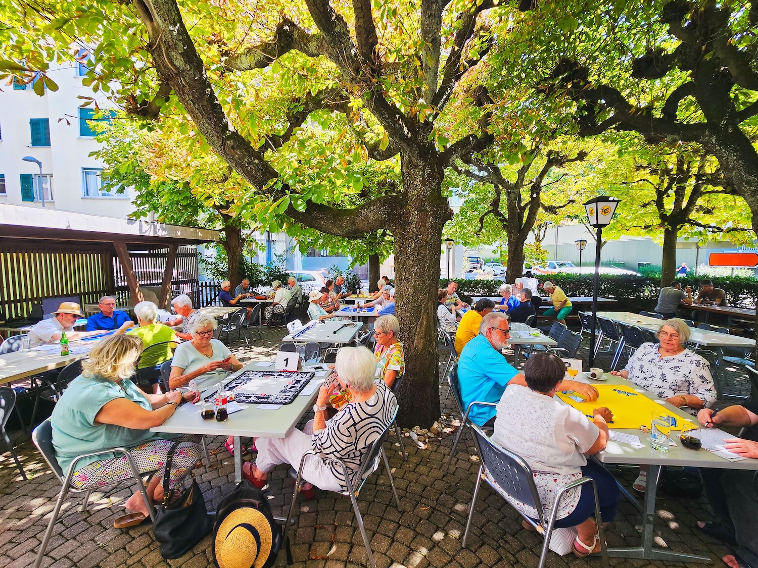 32 Spielerinnen und Spieler hatten sich angemeldet, aktuelle und potentiell zukünftige GPB-Mitglieder und Mitgliederinnen. Mit Freuden tauchten sie unter die kühlenden Kastanienbäume im Garten des Restaurants Seidenhof.